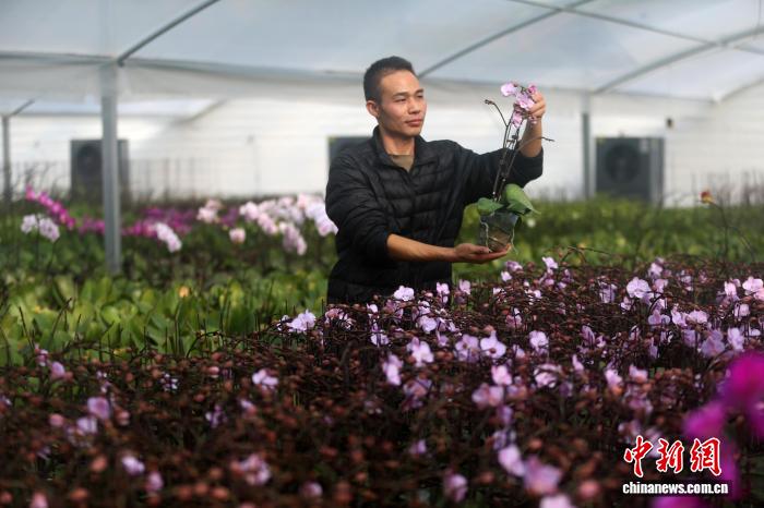 11月25日,花农正在群科镇胡蝶兰下规范繁育基天挨理花苗。弛忠苹 摄